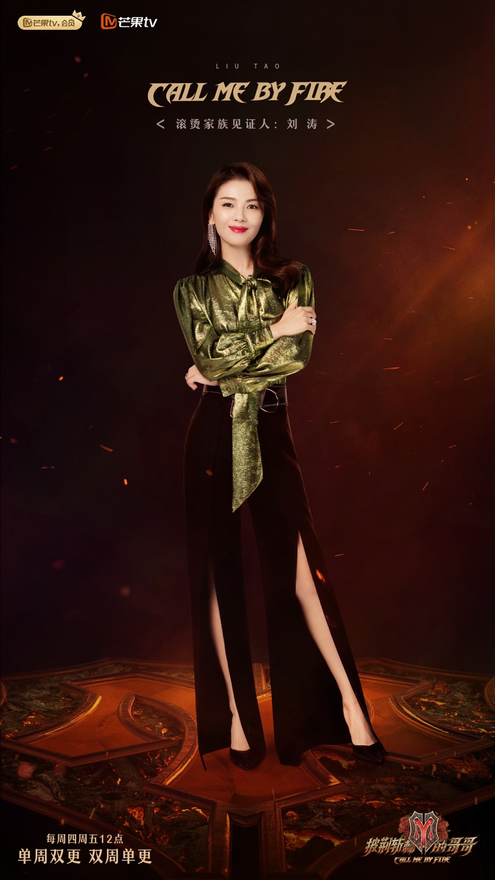 刘涛以一袭森绿色衬衫搭配高开衩裤装造型亮相,状态大好,大波浪长发披肩,琉璃苏耳坠装点复古时尚,刘涛的出场让人眼前一亮,走路带风明星范儿十足,不禁让人感叹刘涛每次的出现精气神都这么好,站上公演舞台气场全开,面对现场热烈的氛围控场能力十足,超稳的台风,专业的业务能力一展强大气场,相比台上专业有度的形象,台下的刘涛喜剧人设暴露无疑,先是凡尔赛式发微博称“看披荆斩棘的哥哥看的我好想去现场(哦我下周就在现场了哈哈哈”,后又联动发博“这次是舞台站票披荆斩棘的哥哥,又是一场激动人心的演唱会,下一场想把话筒换成荧光棒”,“刘涛这次是舞台站票”一词被送上热搜,被称为“人类高质量追星”,刘涛不愧是冲浪达人,太有梗了,化身小迷妹工作追星两不误,前排追星引得网友们羡慕不已。