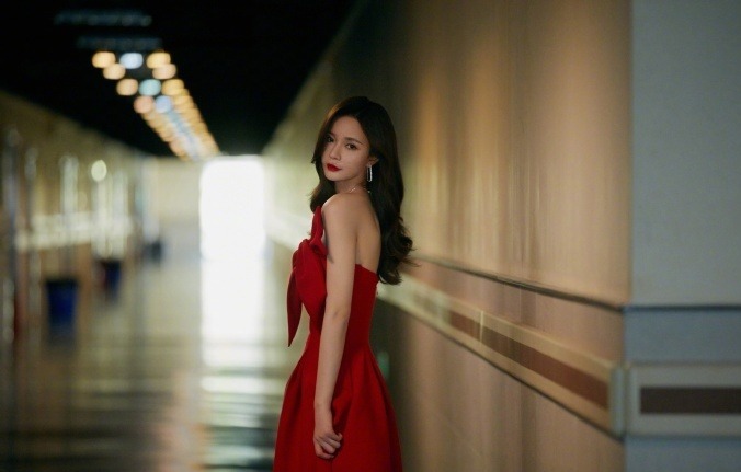 沈梦辰楼道港风大片氛围感十足 黑发红裙梦回90年代