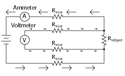 四线制测电阻电压表的电流保持在最低限度,避免了导线的电阻所引起的误差,提高电阻测量精度,如图所示: