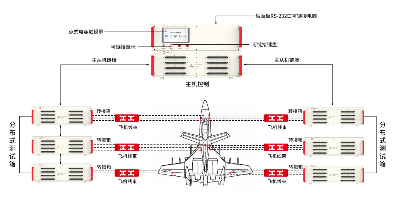 飞机线缆测试系统主要有上位机、线束测试仪主机、分布式从机、电源总线、通讯总线和转接线缆组成。上位计算机进行程序编辑下载及与下位测试主机通讯;线束测试仪主机进行程序的执行和对分布式从机进行通讯,工作时可单机操作,亦可通过以太网连接至电脑操作;分布式从机通过转接线缆,转接箱与飞机航空线缆连接进行接口的数据采集。