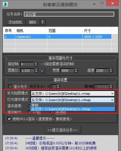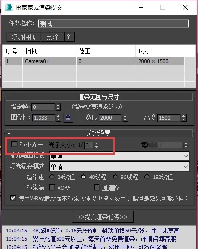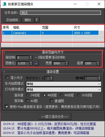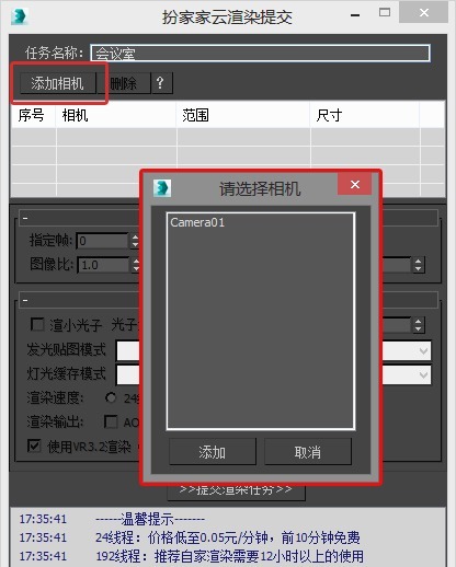 3.弹出【扮家家云渲染提交】后,点击【添加相机】