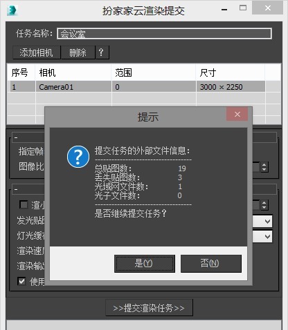 9.以上设置好后,点击【提交渲染任务】,会有资源收集提示,确认没有问题,点击【是】。