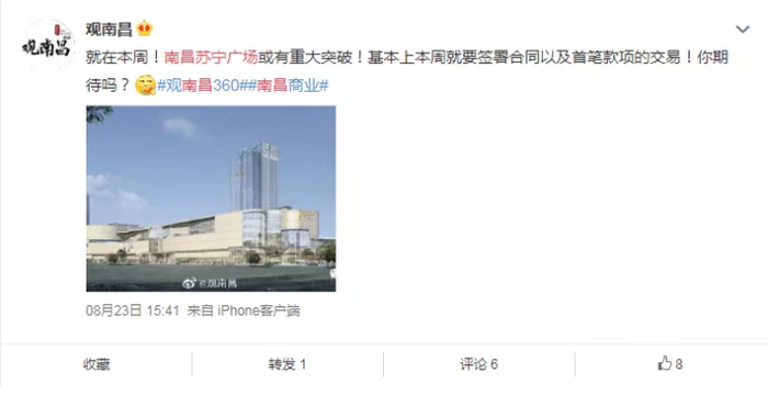 而据微博“观南昌”爆料,本周内,南昌苏宁广场或有重大突破!基本上本周就要签署合同以及首笔款项的交易!