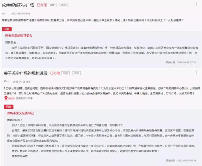 在问政平台上,多地网友纷纷咨询当地的苏宁广场施工是否停滞,包括西安、合肥、潍坊、绍兴等地。
