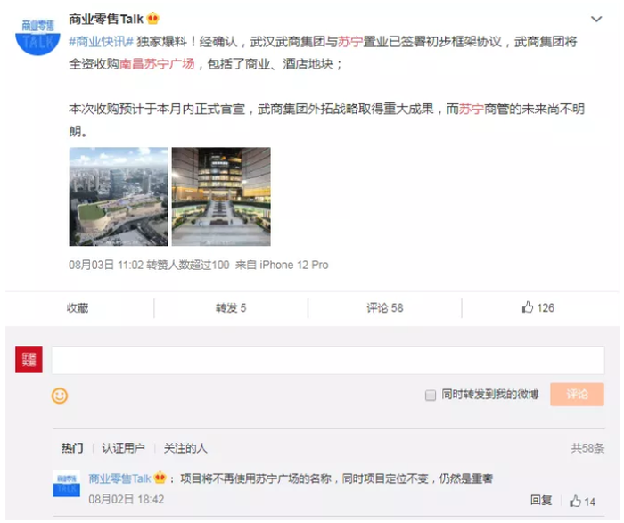 8月初,据微博相关账号爆料,经确认,武汉武商集团与苏宁置业已签署初步框架协议,武商集团将全资收购南昌苏宁广场,包括了商业、酒店地块;