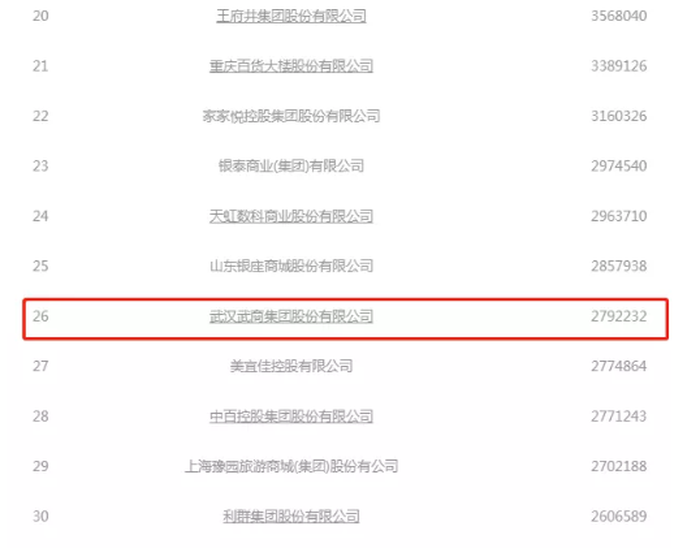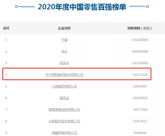 在由中国商业联合会、中华全国商业信息中心联合发布的2020年度中国零售百强榜单,武商集团以销售规模279.22亿元位列第26名,而苏宁集团下的苏宁易购,以销售规模416.31亿元排名第4位。