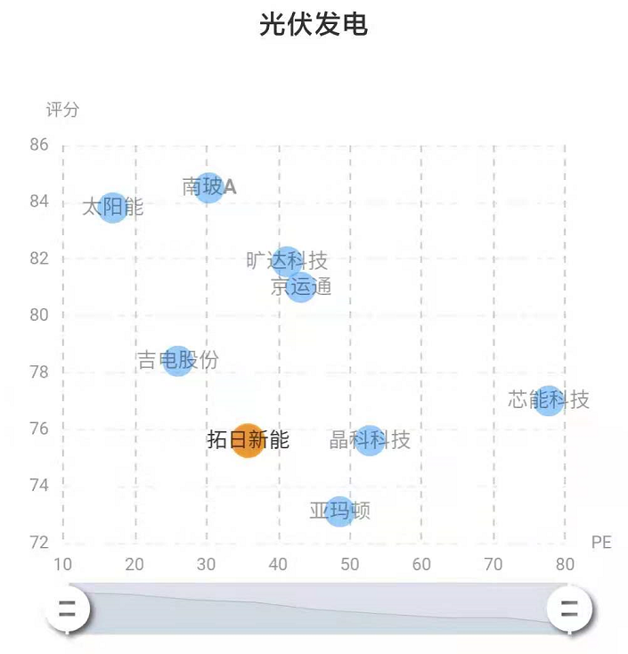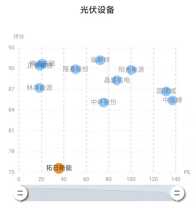 拓日新能的PE约34,处在同类公司的上游;评分是75分,处在同类公司的下游。总体来说,估值不高。但不如同行业的太阳能。太阳能PE约18,评分为84。