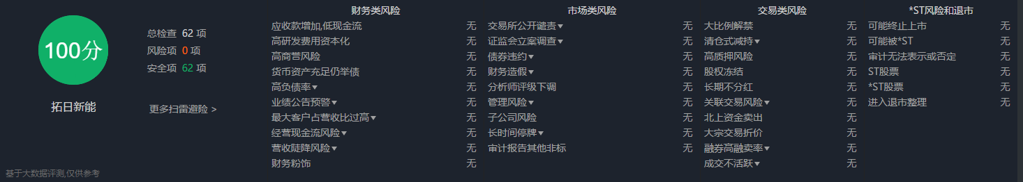 从扫雷宝图中看出,拓日新能评分为75分。从市场类风险、交易类风险、*ST和退市风险方面看,拓日新能近期没有公司经营风险。财务类风险中有高负债率风险。