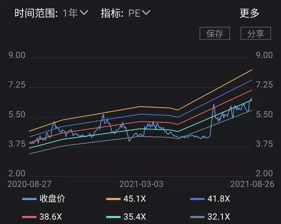 (2)、图中,横轴是日期,纵轴是股价。图中6条线,均为股价走势线。1条是真实股价; 另外5条等间隔线是假设的股价走势,也可认为是市盈率估值的5个分段,从下往上,依次是0%、25%、50%、75%、100%。比如,最上面的45.1X理解为100%估值点。