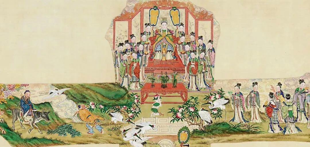 清代张恺绘《群仙祝寿图轴》局部,台北“故宫博物院”藏。图中有偷桃的东方朔。桃,黄里透红,如同长寿老人的鹤发童颜,蟠桃也逐渐有了长生的寓意。