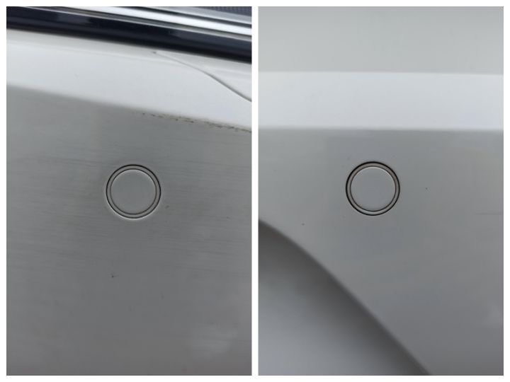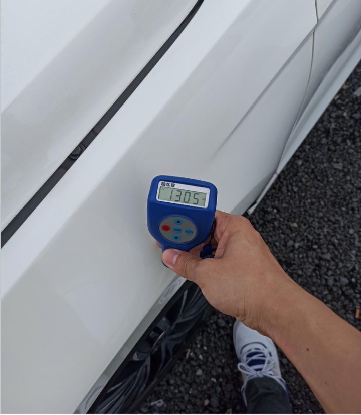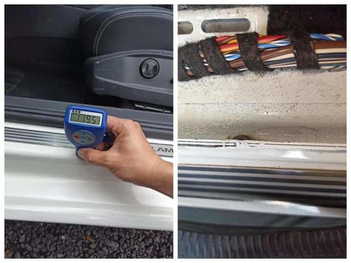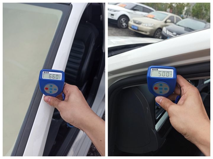 左A柱的外侧漆面厚度很高,赶紧看内侧,同样很高,靓仔心里一沉,这下坏了,十有八九切割了!