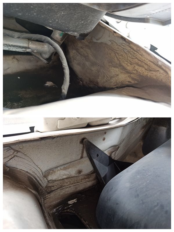 靓仔还是把重点放在左侧,可以看到,左前叶子板边梁内侧的胶是后打的,跟右侧一对比,完全不一样(上左下右),原厂的胶有喷漆,左边的就直接裸露在外。