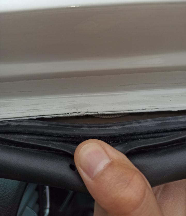 左前门也有严重的钣金修复,拉开车门看到铰链螺丝有摩擦拧动痕迹,再根据胶边焊点的做工可以判断左前门是后更换的。车门都换了,我们就要留意两侧的A柱B柱和上下门框结构了。