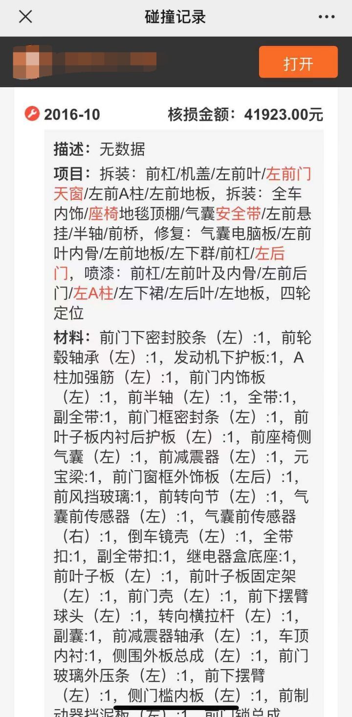 让后台查了一下这车的出险记录,查到了左前事故的记载,一共出险4万多金额,左前部位大面积的材料拆装更换,安全气囊、安全带和仪表台也在其中,与靓仔此前判断的事故受损程度几乎一致。