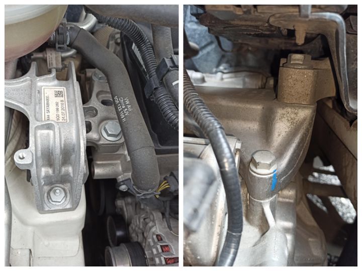随后检查发动机变速箱,看发变有没有因为事故整体吊装下来,第一步自然是看机脚,机脚的作用就是将发变固定在车架上,防止抖动松旷。分别看了发变的机脚,都是原封未动,原厂标记还在,说明发变不存在吊装的情况。