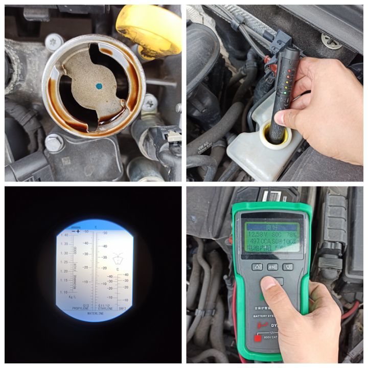 全车油液部分,机油成色一般,刹车油笔显示制动液含水量超标,需要及时保养更换;防冻液的冰点在零下50度,可以放心使用;电瓶寿命100%,状态良好。