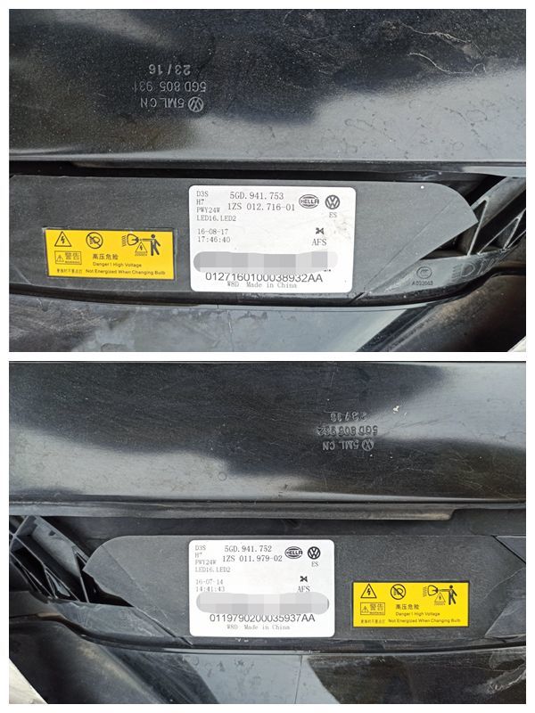 两边的大灯与两块铁支架连接板没动过,再三看了两次还是同样的结果,而且制造日期均符合车辆出厂时间,左前那么大的维修,左前大灯竟然没事?