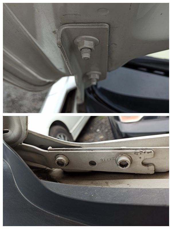 这里是减震器塔顶与叶子板边梁连接的地方,此处的胶也是后打的,塔顶的螺丝也有拆卸痕迹。