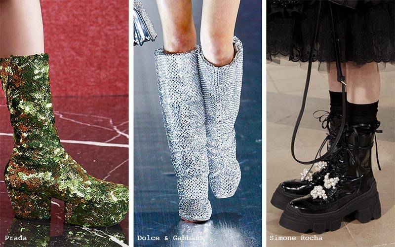 秀场上,卡罗莱娜·埃雷拉(Carolina Herrera)在黑色靴子上镶着小心形图案。Vetements在靴子上洒上珠宝和色彩,Etro在他们的靴子上缝上辫子,普拉达(Prada)在鞋子上滴着亮片。