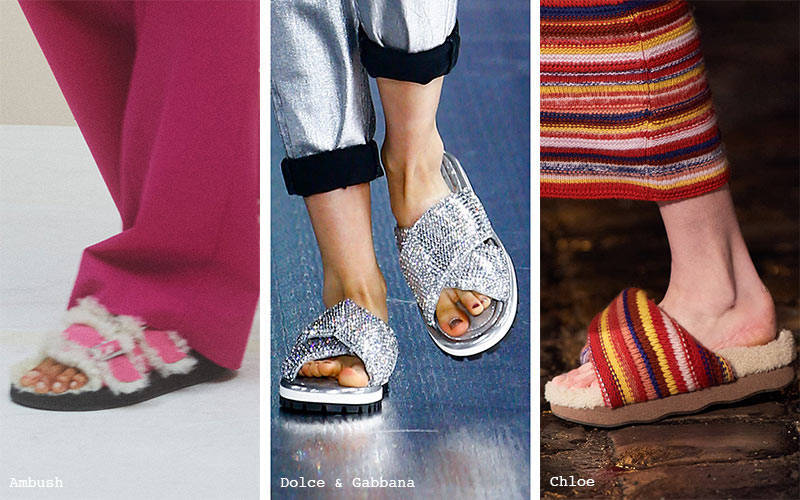 秀场上蔻驰(Coach)通过尝试让拖鞋更适合户外而轻轻踏入了这一潮流,而蔻依(Chloe)则觉得有必要继续享受拖鞋的毛绒舒适,并向人们展示了拖鞋真的可以与优雅的裙装搭配。其他喜欢拖鞋造型的设计师还有奥图扎拉(Altuzarra)和普罗恩萨·施罗(Proenza Schouler),前者将绒毛做成了戏剧性的效果,后者将袜子和拖鞋结合在一起,打造出了终极舒适的鞋子。