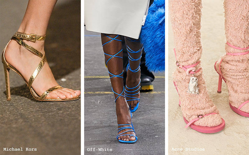 随着本季镂空剪裁的流行,系带凉鞋也成为了主流。迪奥(Dior)推出了复杂且不对称的肩带,而莫莉·戈达德(Molly Goddard)则利用肩带创造了蝴蝶结和菱形图案,进入了高度细节化的一面。普罗恩萨·施罗(Proenza Schouler)设计了一款适合冬季穿的鞋,向我们展示了这种鞋与袜子和打底裤的完美搭配。