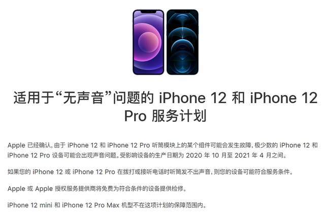 这次苹果召回的产品包括了iPhone12和iPhone12 Pro,两款产品都可能会存在听筒没声音的问题,苹果确认是听筒模块上的零件发生故障,涉及到的产品生产日期是从2020年10月到2021年4月。在发布召回信息之后,如果再有类似的情况,用户送修的产品会得到免费维修。