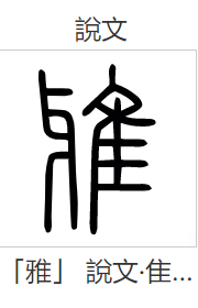 相比于“诗”,这个“雅”字的字形更加“无理”。据许慎《说文》,“雅”字从隹,牙声,是古代秦人对一种鸟的称呼。“雅”字以“牙”为声,它的篆体是这样的: