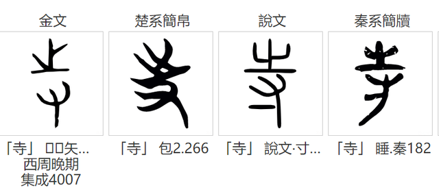 “诗”字以“寺”为声。而“寺”从“之”、从“寸”,是由上下两部分组成的。从金文以至秦简,这两部分一直各自独立: