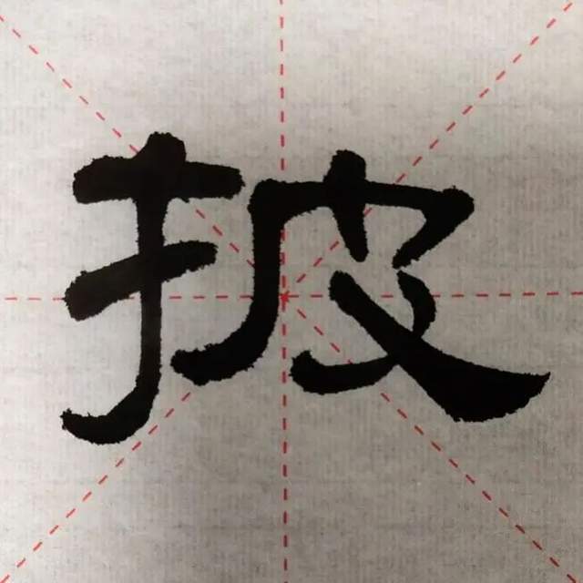 我个人的看法,是要把“扌”的两横尽量向右伸展,也就是说竖钩穿过两横的时候,应该在中线偏左的位置。这样一来,让“扌”的两横和“皮”的竖撇相互吃进对方的空挡处,字体结构的联系就建立起来了: