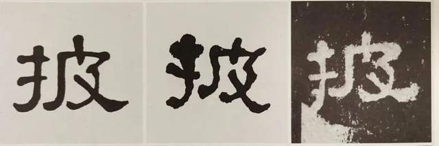 但是《张迁碑》的原作者显然想要规避这种效果,所以他把“扌”的竖钩写得更长,出波更含蓄,而“皮”的竖撇则颠倒过来,写得更短,出波更夸张。