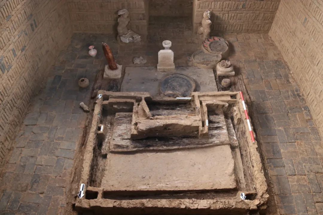 据大同市考古研究所副所长侯晓刚介绍,该墓葬为长斜坡墓道方形单室四角攒尖顶砖券墓,由墓道、甬道、墓室组成,南北总长15米、墓底距地表7米。其中,墓室中部搭建了一处木堂,堂内置木塌,未见棺,均已腐朽,仅存痕迹。何为木堂?其实就是用木头搭建了一所“房子”,类似于椁的作用,因为年代久远,木堂已经腐朽,但建造之初所使用的青铜器“铺首”,还散落在墓葬之中,也为考古工作者的发掘工作留下了一些可以研究的线索。