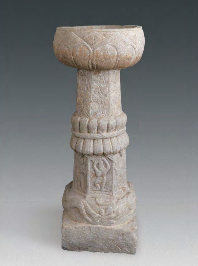 在该墓葬中,还发现一件黄白色砂岩质所造的石灯,通高45.4厘米,由灯盏、灯柱、底座三部分组成,整料雕制而成。灯盏外壁雕刻双层复瓣仰莲纹,灯柱上部中有几处还刻有跳跃或舞蹈姿态的人物;下部八面以浅浮雕法分刻舞蹈人物、犊鼻裤投丸表演人物、犊鼻裤吞剑表演人物、演奏排萧人物、鲜卑装男性长袖舞蹈人物、鲜卑装女性长袖舞蹈人物、鲜卑装男性敲束腰鼓人物、鲜卑装男性弹琵琶人物,人物之间以列柱分开。底座上层雕刻首尾相衔的二龙,下层为素面。其雕工精美、体量庞大,也似乎印证了墓主人的身份非同一般。