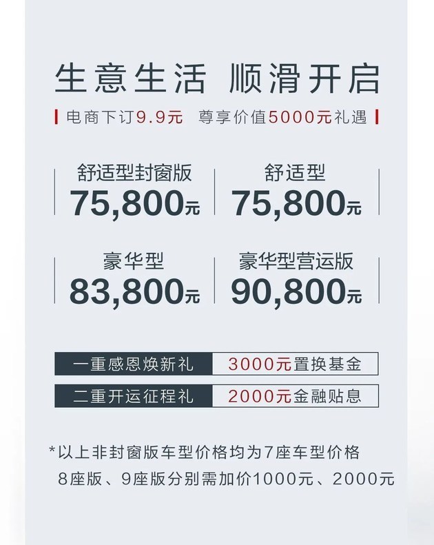 五菱征程共推出4款车型,指导价格区间为7.58-9.08万元。值得注意的是,本次入门级车型为封窗版,其余车型均为7座布局,而8座版、9座版分别需加价1000元、2000元。官方将提供3000元置换基金和2000元金融贴息。