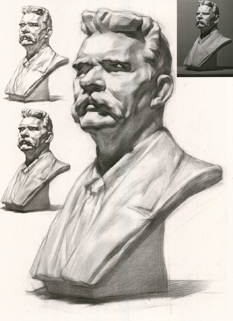 想要画好石膏头像,就要先练习好简单的石膏几何体,从中找到石膏的手感、特征、刻画方法,将之运用到石膏头像中去,而不是直接开始用石膏头像进行练习,心计吃不了热豆腐。