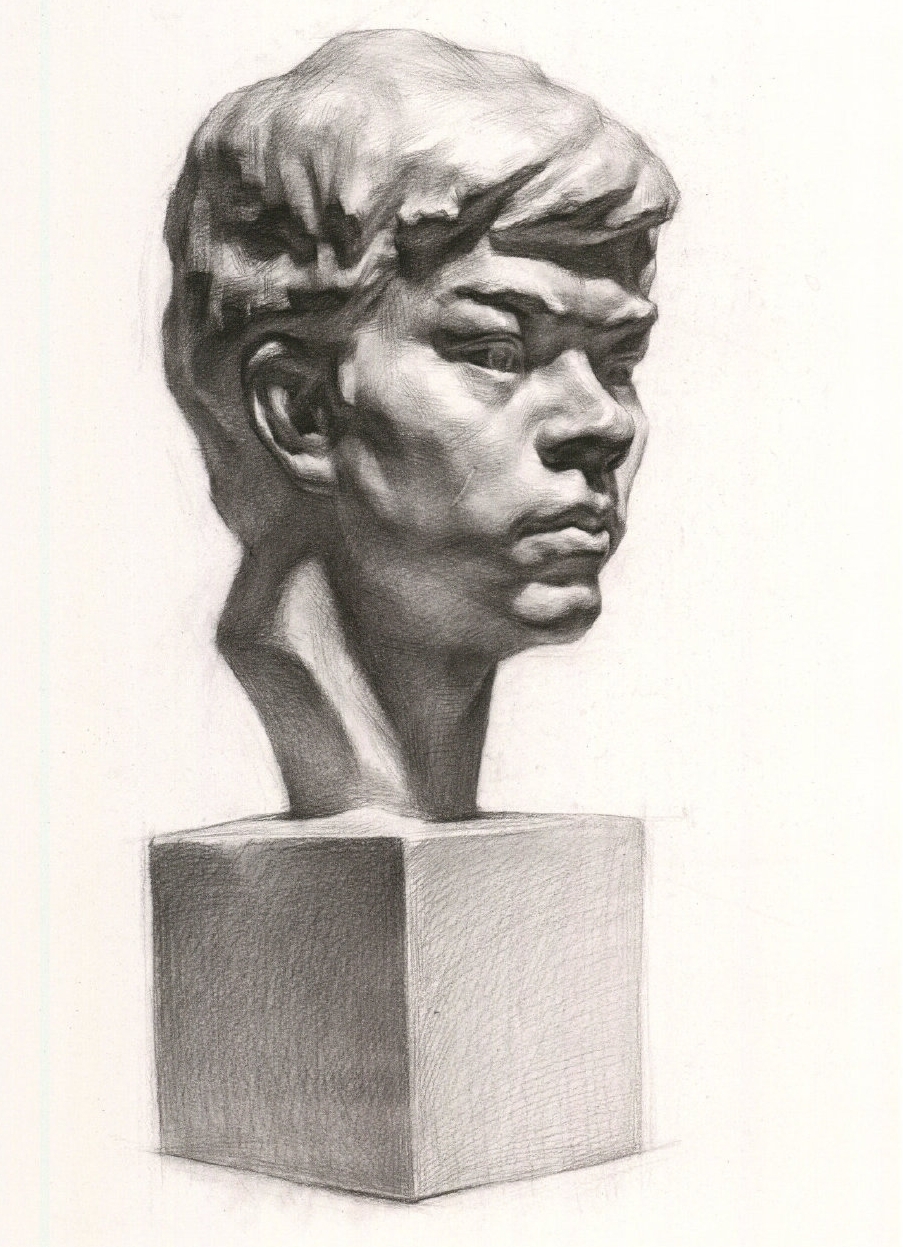 石膏质地坚硬,形体结实,很多同学画出来反而不像石膏像的原因是将形体画的过圆、软。画石膏像要做到宁方勿圆,体面关系要具体,塑造要肯定,表现出石膏像坚硬的质感。