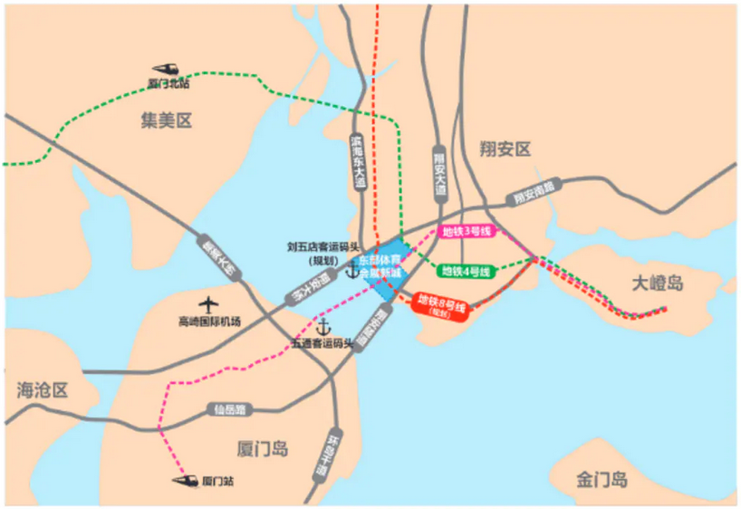 在交通上,新城除了翔安大道、翔安隧道、翔安大桥(预计2022年底通车)、滨海东大道等主干道纵横交错,此外地铁3号线已开通,一站直达五缘湾(注:体育会展、东界、洪坑站点尚未开通);与此同时,新城内的还有4号线(在建)、8号线(规划)交汇贯通,可快速接驳厦门火车站、高崎机场、翔安新机场、厦门北站等重要枢纽。