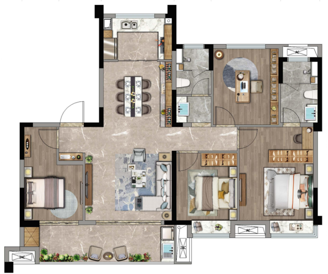 大户型的打开方式,当然少不了TA。雲上131㎡宽境四房,南向主卧约21㎡的套房式设计,带有独立的卫生间和可配备衣帽区,更享有270°大转角观景飘窗,大大拉升整体生活品质。