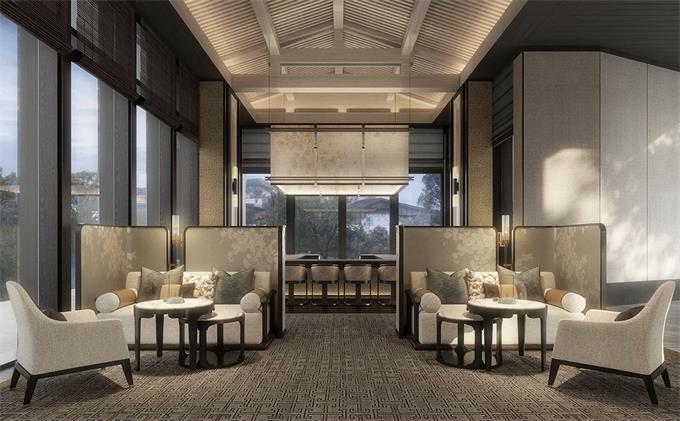 最后一种新中式轻奢风格,和前面的新中式还是有很多区别,用现现代设计手感来把复杂简单化,以此来表达空间感,营造出一种对称感和空间色彩感,导致整个空间更加立体,墙面颜色总体偏向低调,局部用暖色使色彩之间有对比,使私人会所家具更是独具韵味。