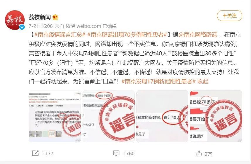南京疫情期间出现的网络谣言也大多是以聊天截图形式在传播。图片来源:微博@荔枝新闻