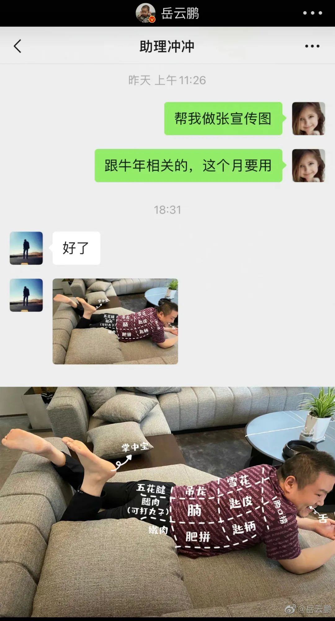 岳云鹏经常在微博上发布和助理互怼的搞笑截图。图片来源:微博@岳云鹏