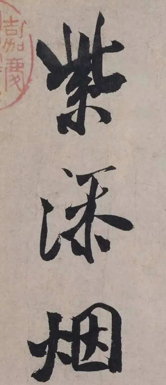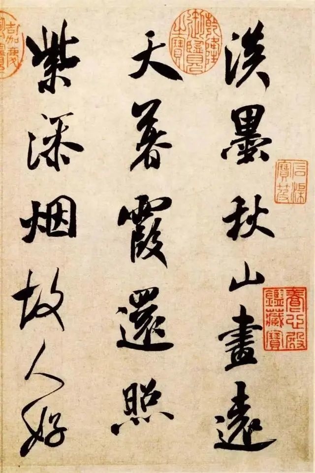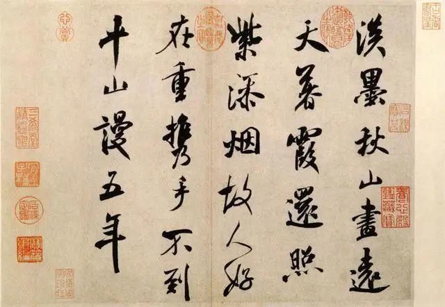 米芾《淡墨秋山诗帖》自作七绝一首,运笔如刷,笔力雄健,使转灵动,结字端妍,结态造势宽展肥美,精神饱满,无款印。 当为米芾中年书法之精品。