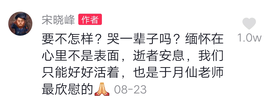 针对网友的一些言论宋晓峰也进行回应,在评论区表示哭都是表面的,缅怀在心里,好好活着才是对于月仙老师最大的安慰。