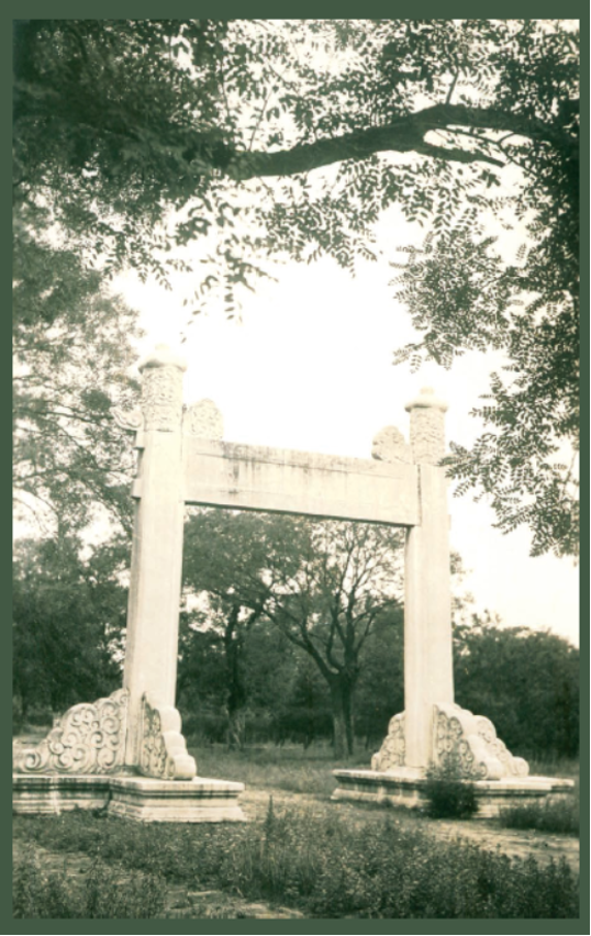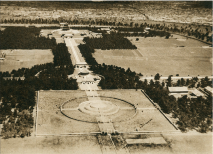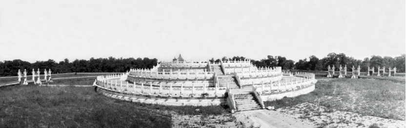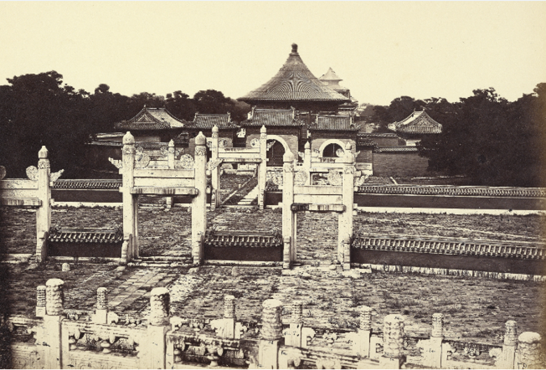 这张照片是在圜丘上拍摄的,可以看出圜丘的白玉栏杆和内外两重壝墙及内外两座棂星门。壝墙均为蓝琉璃筒瓦通脊顶,墙身涂朱。棂星门也是古代祭坛的专用门式,形似牌坊,是六柱三门结构。此照片是英军随军记者费利斯·比托(Felice Beato,1832—1909)于1860年在圜丘坛上,北向拍摄的圜丘坛、棂星门及皇穹宇。这是目前发现的最早的一张圜丘坛照片。
