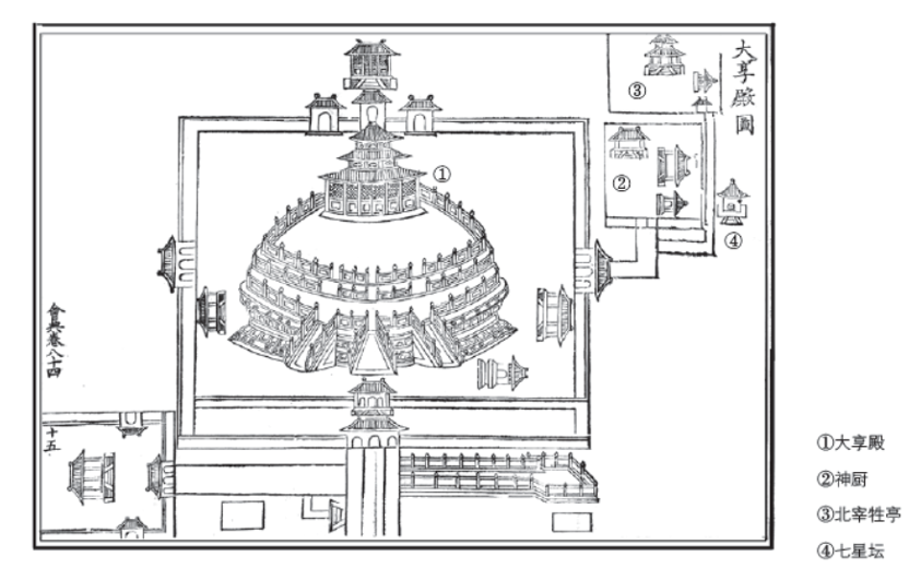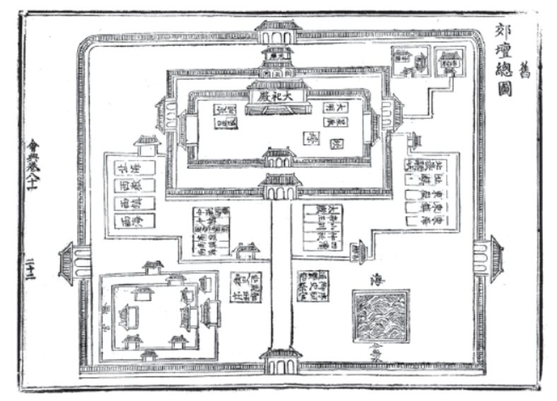 明朝永乐皇帝修成的天地坛的平面图,出自《大明会典》。大祀殿是天地坛的主体建筑,为一矩形大殿, 用于合祀天、地。可以算是后来祈谷坛内“祈年殿”的“前世”了。
