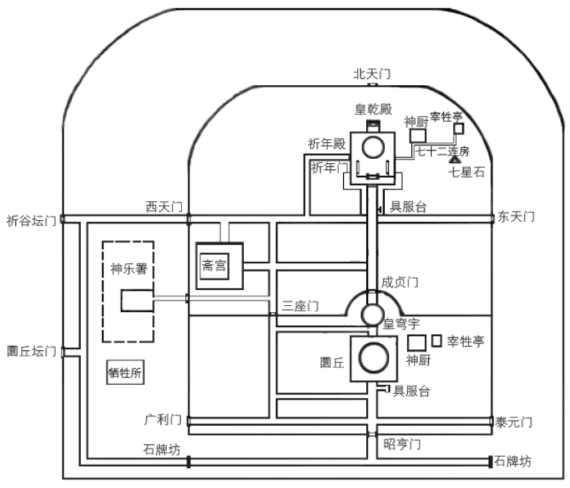 第一层墙为方形,叫外壝墙(四面正中各有一座棂星门), 第二层墙为圆形,叫内壝墙(四周各有一座棂星门)。内外壝墙之间还有12个燎炉,东南方向有燔柴炉和瘗坎,西南方向有望灯杆。