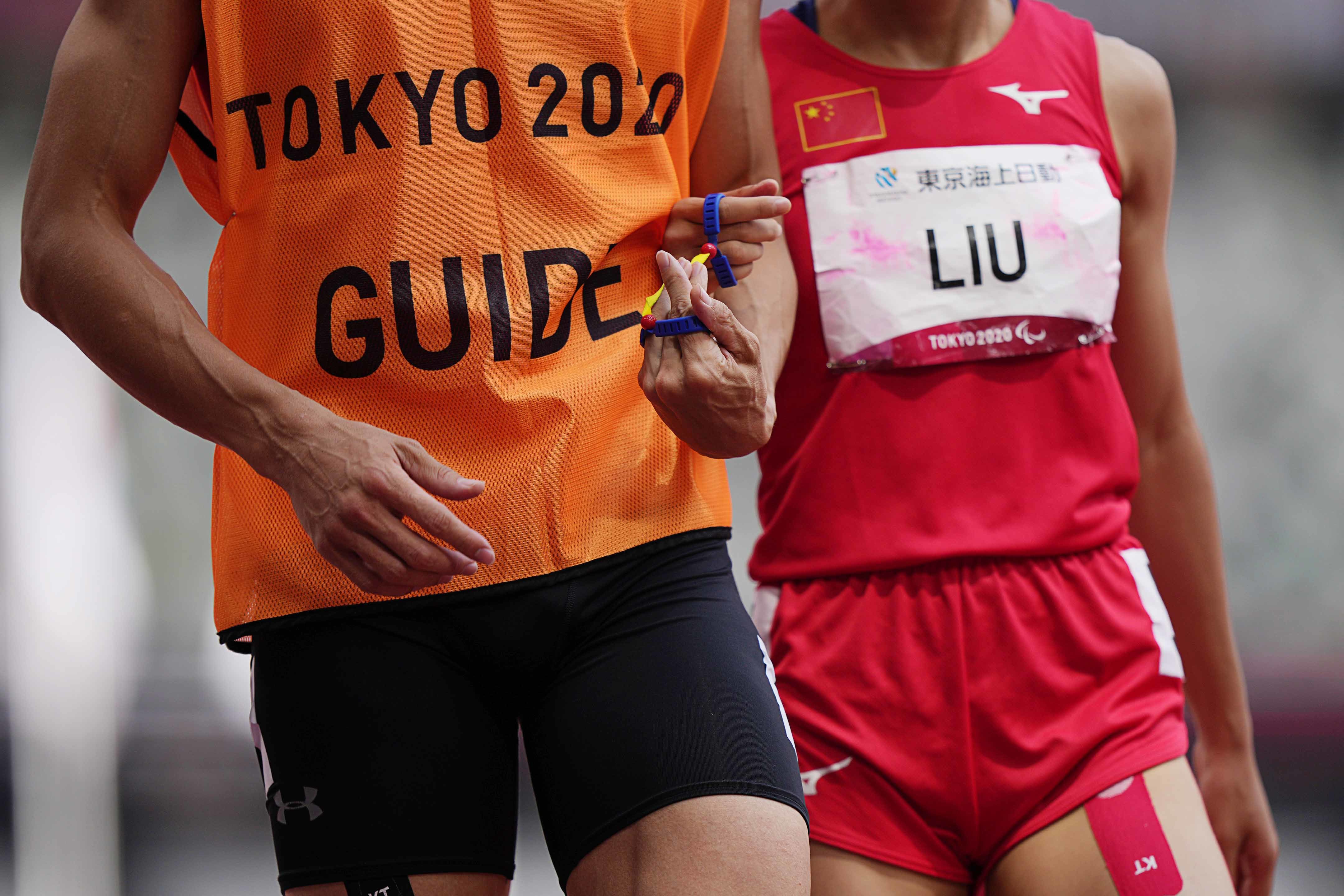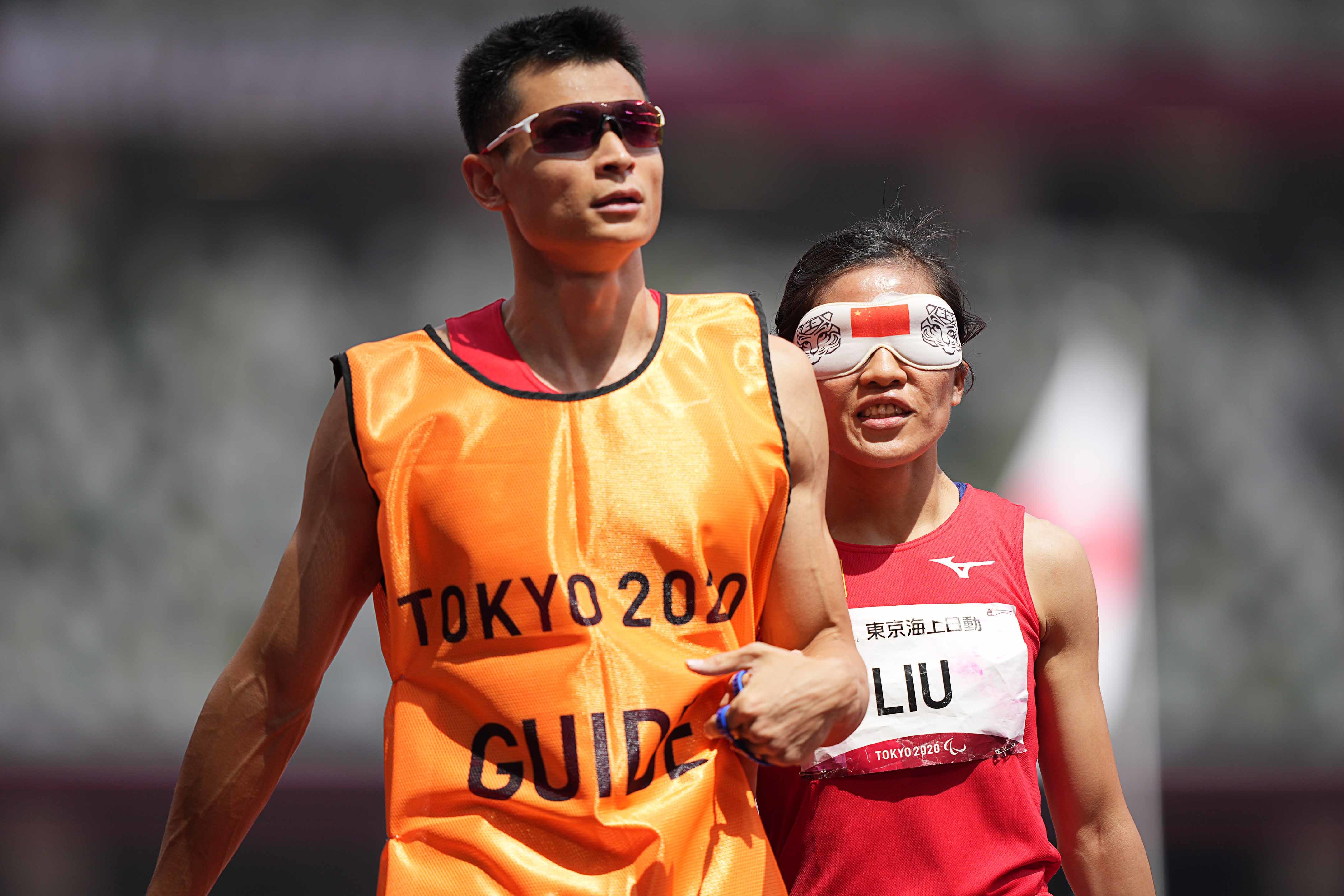 8月30日,比赛结束后中国选手刘翠青(右)和领跑员徐冬林离开赛场。新华社记者 熊琦 摄