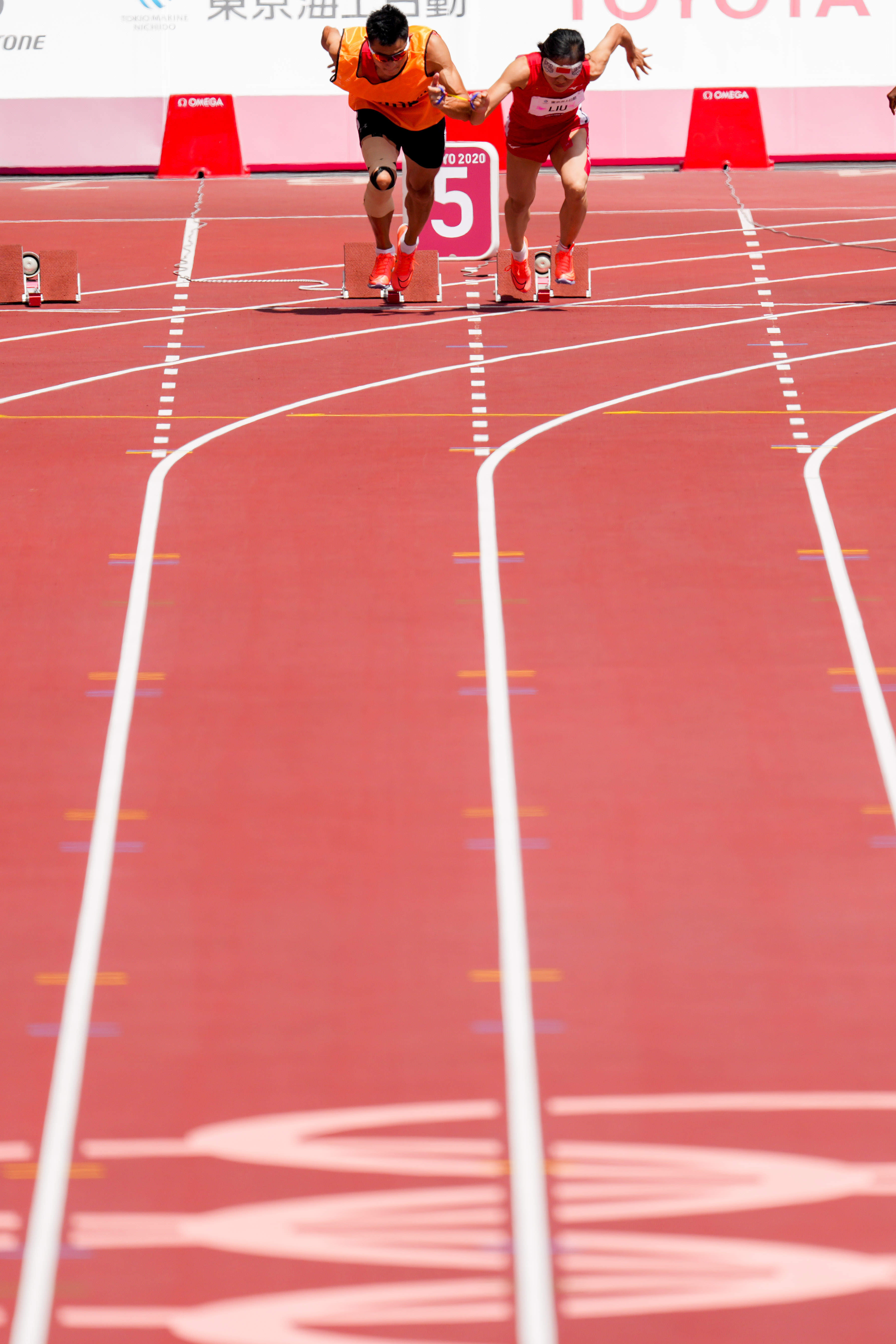 8月30日,中国选手刘翠青(右)和领跑员徐冬林在比赛中起跑。新华社记者 朱炜 摄