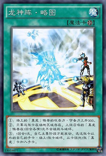 ①场上的真龙怪兽的攻击力·守备力上升300。②只要这张卡在场地区域存在,上级召唤的真龙怪兽在1回合各有1次不会被战斗破坏。③1回合1次,自己主要阶段才能发动。选这张卡以外的自己的手卡·场上1张卡破坏,从卡组把1张真龙卡加入手卡。