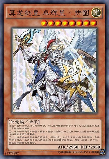 真龙剑皇卓辉星·拼图,隶属《真龙》卡组,拥有二速炸卡的强力效果和高度抗性。正因为如此强力的效果成禁卡。一代剑皇,终成传说。