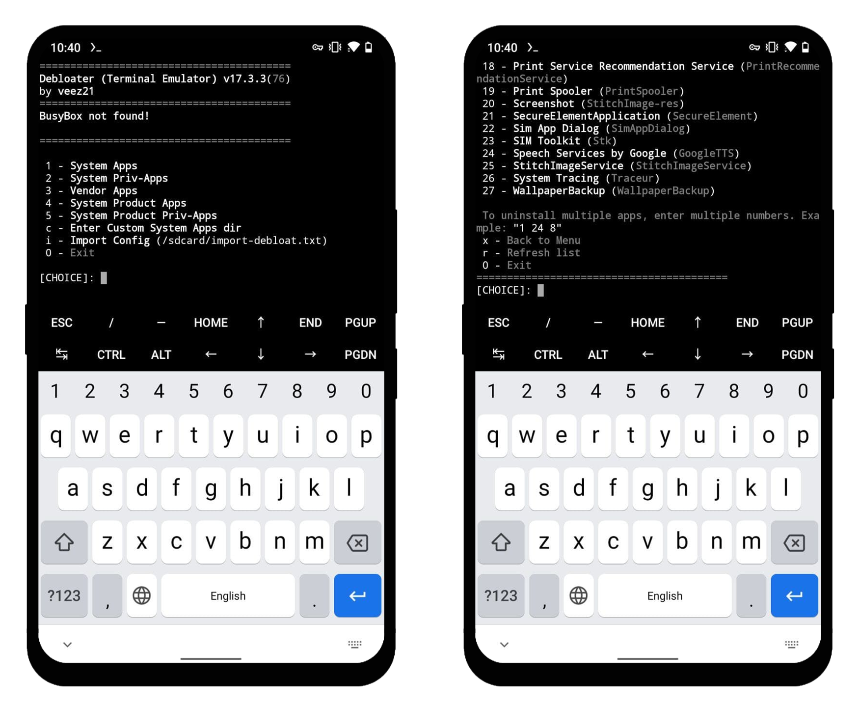 Debloater 可以精简无法停用的系统预装应用。相比于 ADB 手动操作,它的优势在于不需要用户手动键入复杂的应用包名,只要选择终端中列出的数字。由于并非真正意义上的卸载,不小心出了错也可以及时挽救。